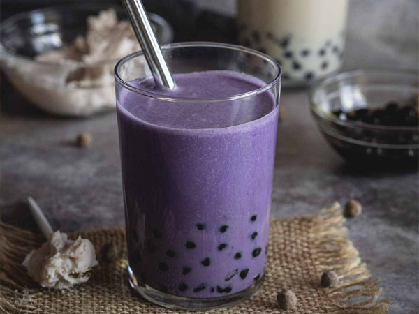– Pour in your tea. Then pour in the taro milk